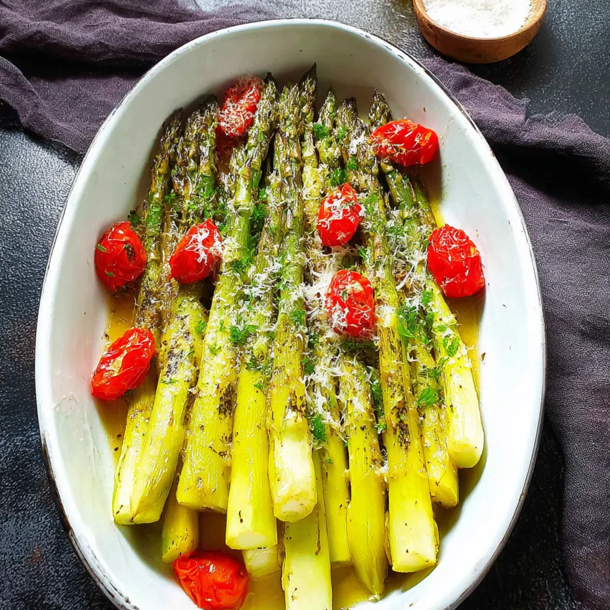 Wenn die Stangen im Ofen schmoren, entfaltet der Spargel sein volles Aroma, die Tomaten platzen leicht auf und alles wird von einer goldenen Schicht Parmesan gekrönt. Knackig, würzig und ein bisschen fruchtig – du kannst gar nicht anders, als einen heißen Bissen direkt vom Blech zu stibitzen.