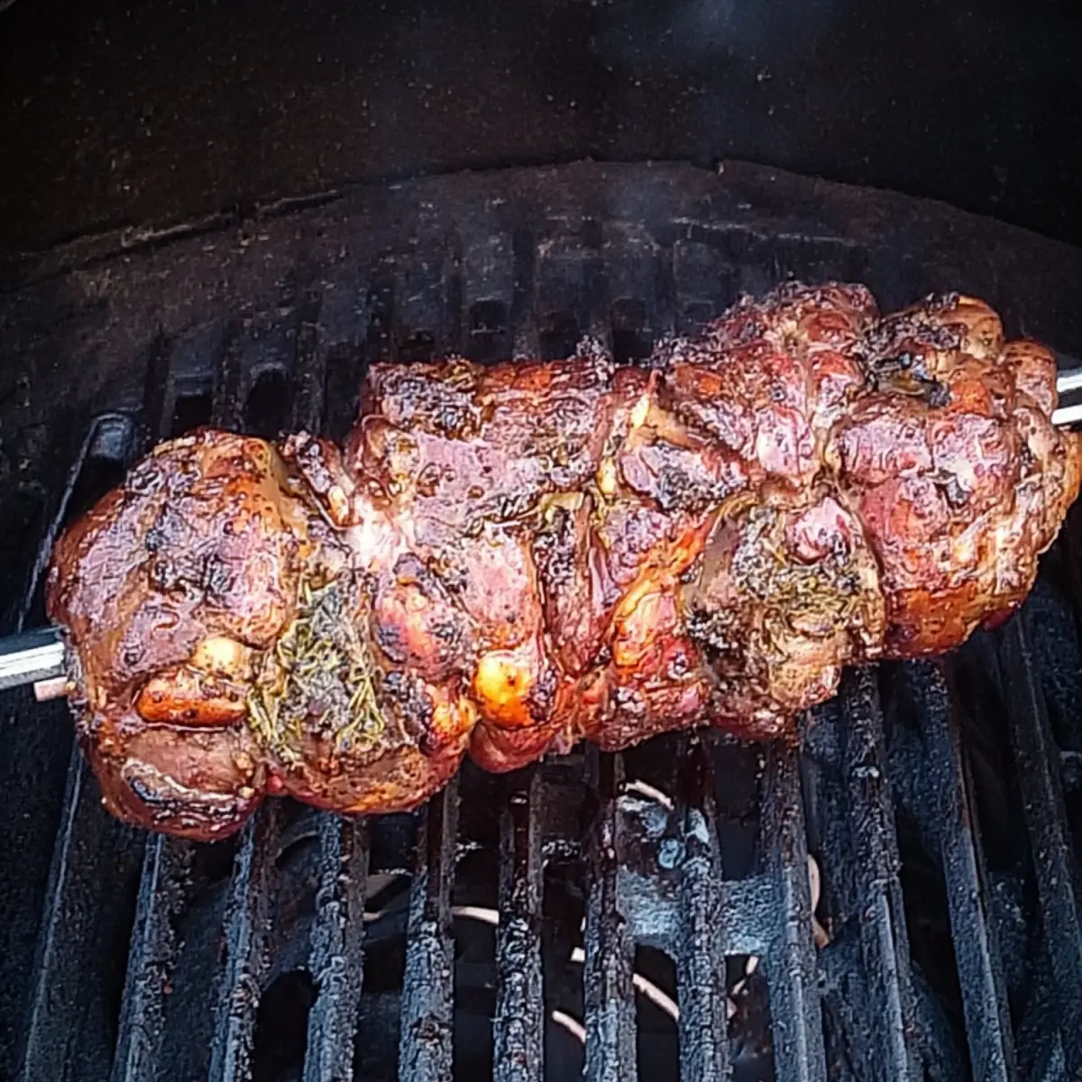 5. Deckel zu lassen und geduldig abwarten: Der Grill füllt sich rasch mit würzigem Rauchduft. Gelegentlich die Spieße drehen und immer mal wieder großzügig mit Öl bepinseln – das sorgt für Saftigkeit und verhindert, dass die Oberfläche trocken wird oder zu dunkel gerät. Nach ein paar Stunden sind die Stücke weich, fast buttrig – perfekt!