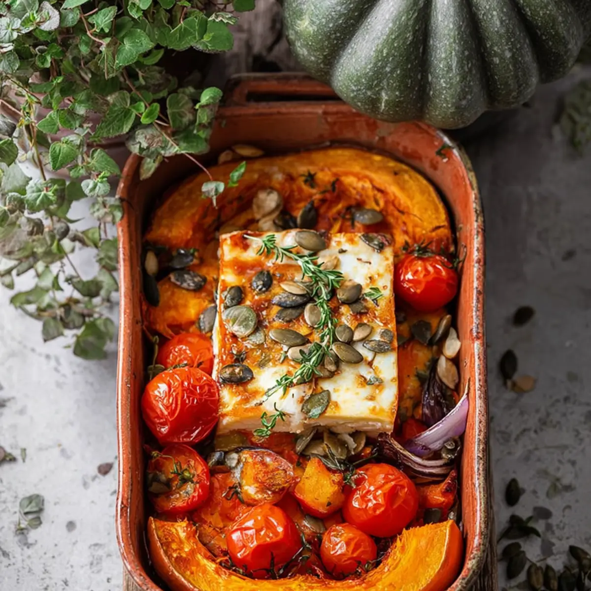 5. Platziere den Feta mittig über dem Kürbisgemüse; verteile die Tomaten rundherum. Noch ein Klecks Olivenöl drüber, weiter im Ofen backen, bis der Feta goldbraune Stellen bekommt und alles zart und duftend ist.